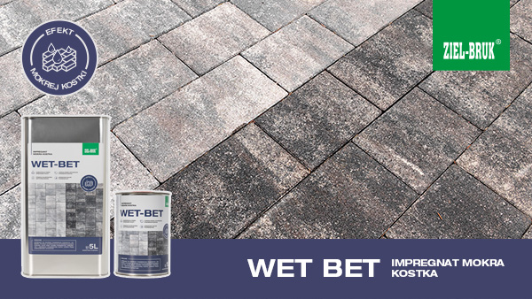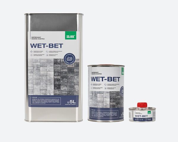 - WET-BET - Rozpuszczalnikowy impregnat o wysokiej odporności na ścieranie przeznaczony do ochrony betonowej kostki brukowej, płyt oraz elementów małej architektury. Wzmacnia i wyrównuje kolor impregnowanego podłoża dając efekt „mokrej kostki”. Głęboko penetruje powierzchnie, zapewnia ochronę przed niekorzystnym działaniem wody, redukuje skłonność do zabrudzeń i ułatwia samooczyszczenie powierzchni pod wpływem opadów. Ogranicza wnikanie wody w mikropęknięcia i pory, zapobiega rozwojowi grzybów, mchów oraz powstawaniu wykwitów. Posiada właściwości antypoślizgowe i odporność na wysoką temperaturę.