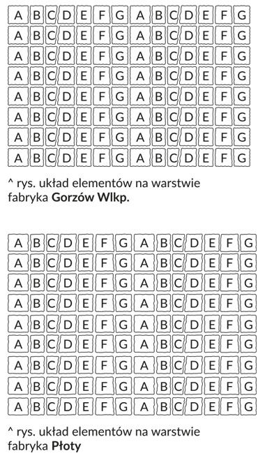 | ilość elementu na warstwie [szt.] | po 16 z każdego elementu | po 16 z każdego elementu | po 18 z każdego elementu | po 18 z każdego elementu | |||||